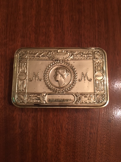 During my college years I would occasionally pick up some spending money working for a dealer in European antiques. Most of my duties entailed delivering high-valued pieces to well-healed clients, and occasionally I would do whatever chores needed to be done around the store. One day, I noticed on the workbench several small, brass boxes buried amid the clutter. Embossed on their lids was a portrait of a woman and the decorative patterns that encircled her profile; though dulled by years of neglect, these artifacts were nonetheless compelling. The shop owner explained to me that these were cigarette boxes Princess Mary had given to British troops at Christmastime 1914, the first year of “the Great War.” Hers was the portrait that adorned the lids amid their ornate designs.